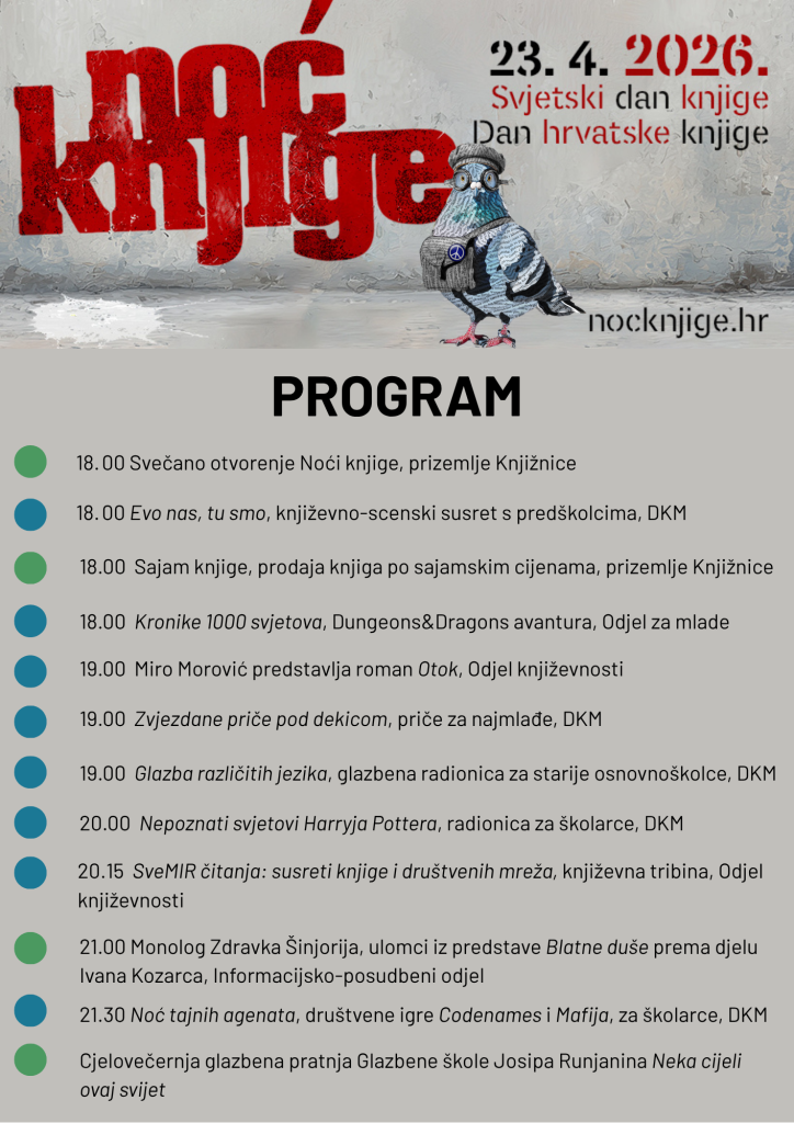 čast nam je i zadovoljstvo pozvati vas na cjelokupni program Noći knjige 2026. Svečano otvorenje je u 18.00 sati. Veselimo se vašem dolasku!